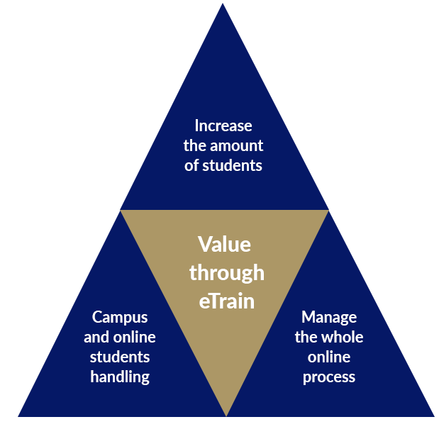 • eTrain offers universities/schools a platform to increase the number of students by means of live transmission of lectures (totally online and/or on campus) as well as with repeat function - these are recorded in top video quality